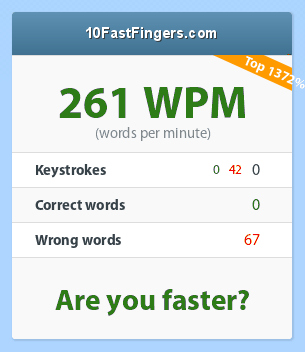| Anda 90.07% lebih cepat dari pengetik lainnya (dengan posisi ke-100 dari 4166, dalam 24 jam terakhir) | |